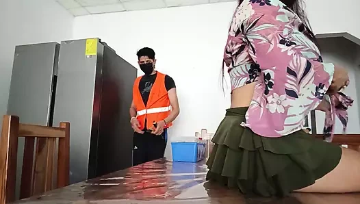 It happened in Colombia!! The most slutty Cinderella of all gets on the table and starts fingering herself dirty while the maintenance technician checks and repairs the house refrigerator.