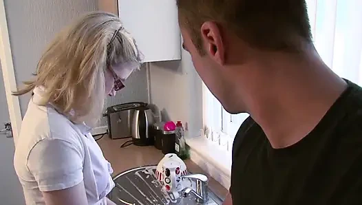 Azgın sarışın genç kız mutfakta sikiliyor ve sağıyor