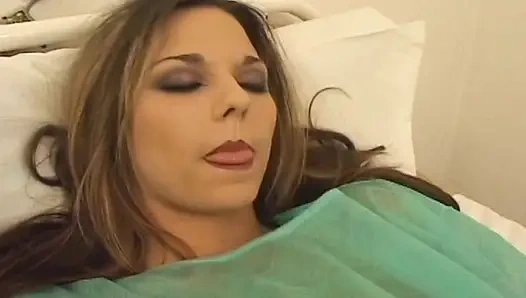 Slutty brunette babe with amazing body lies on the sanitarium bed and gets examed by several doctors before sucking their fat cocks and getting her twat banged hard until massive cumshots.